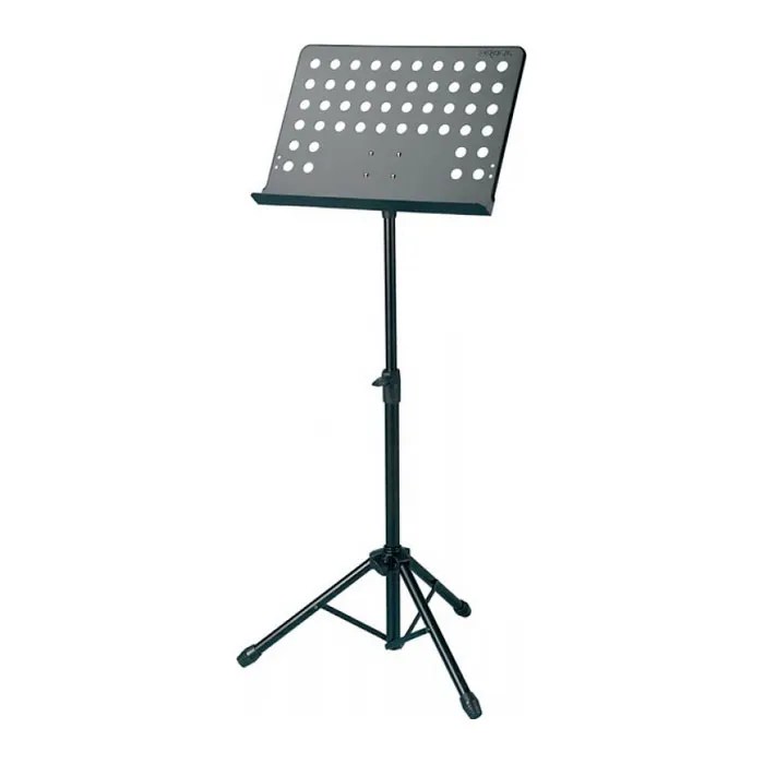 Atril profesional para orquestas, con apoya partituras en metal perforado orientable y capaz de soportar carga.