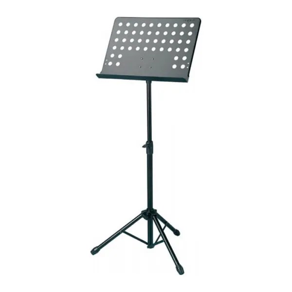 Atril profesional para orquestas, con apoya partituras en metal perforado orientable y capaz de soportar carga. Incluye bolsa en nylon.