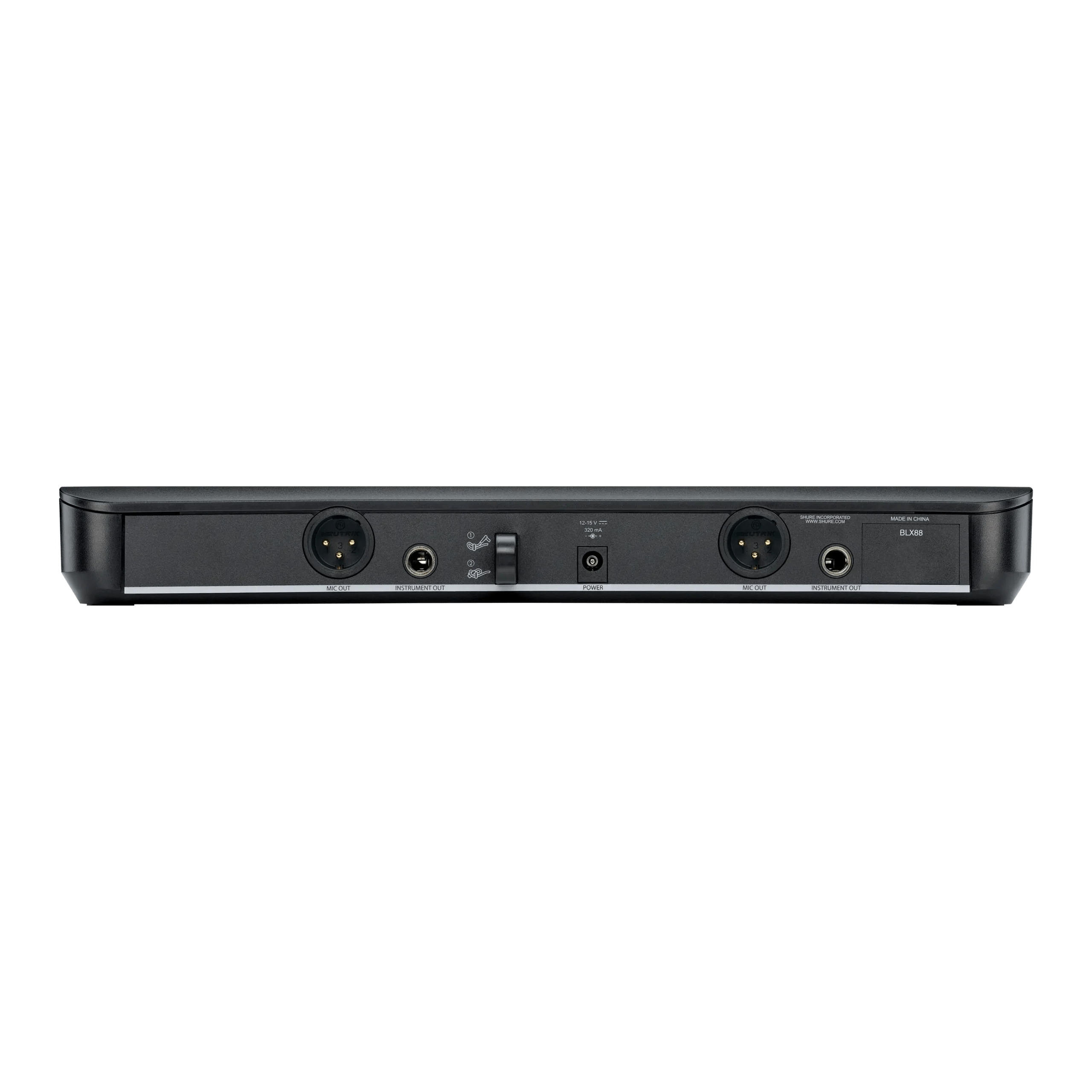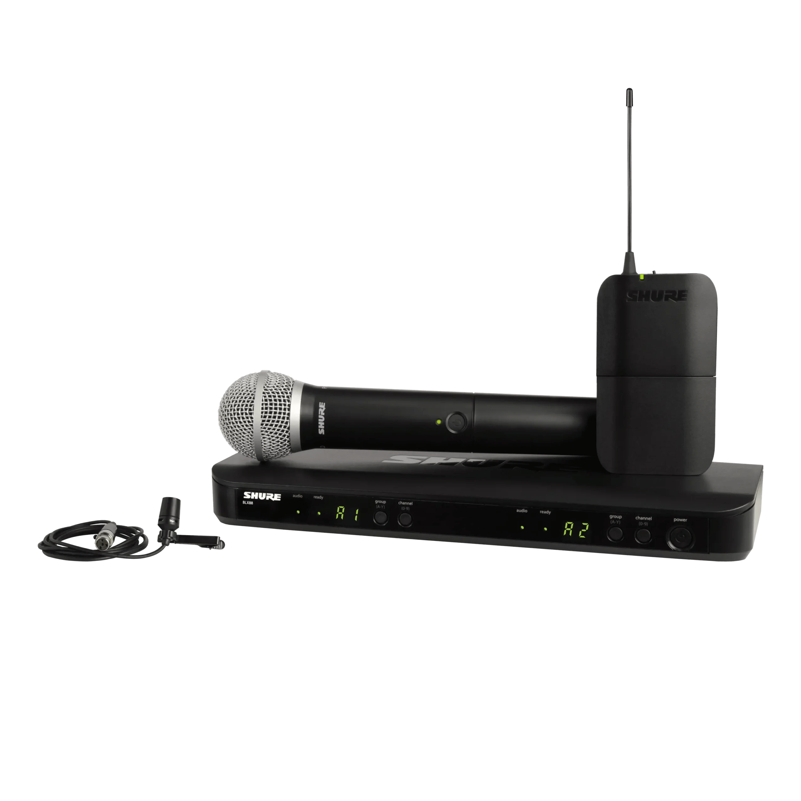 El sistema incluye un receptor de doble canal BLX88, micrófono de solapa CVL con bodypack BLX1 y transmisor de mano PG58, fuente de alimentación, clip de micrófono, clip de solapa, paravientos de solapa, 2 juegos de baterías AA y guía del usuario.